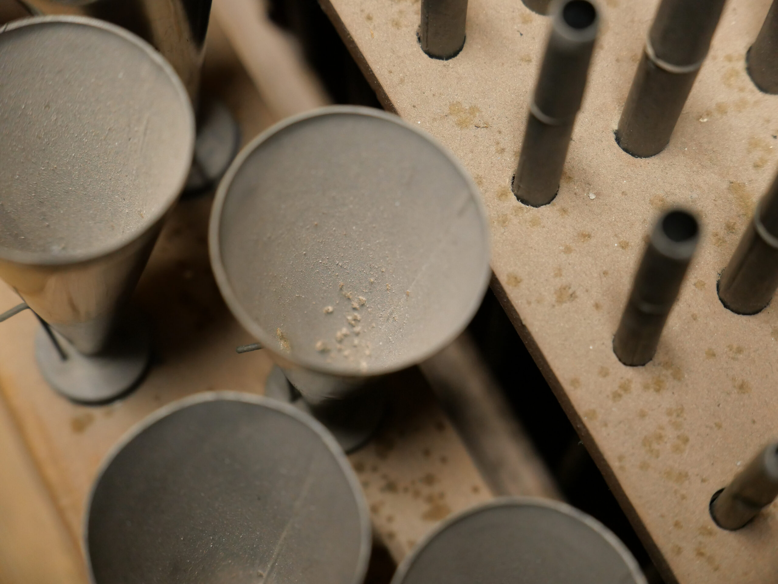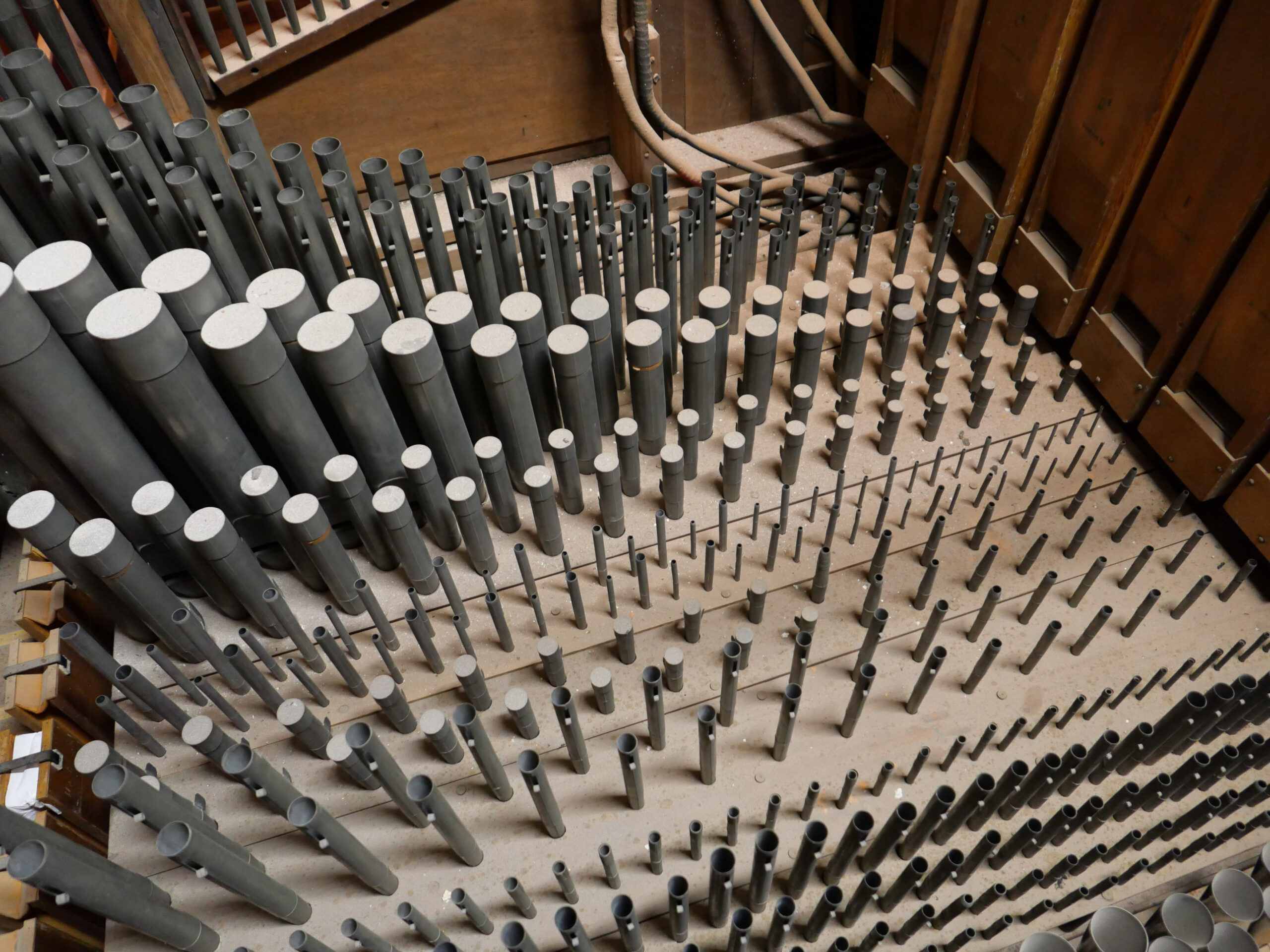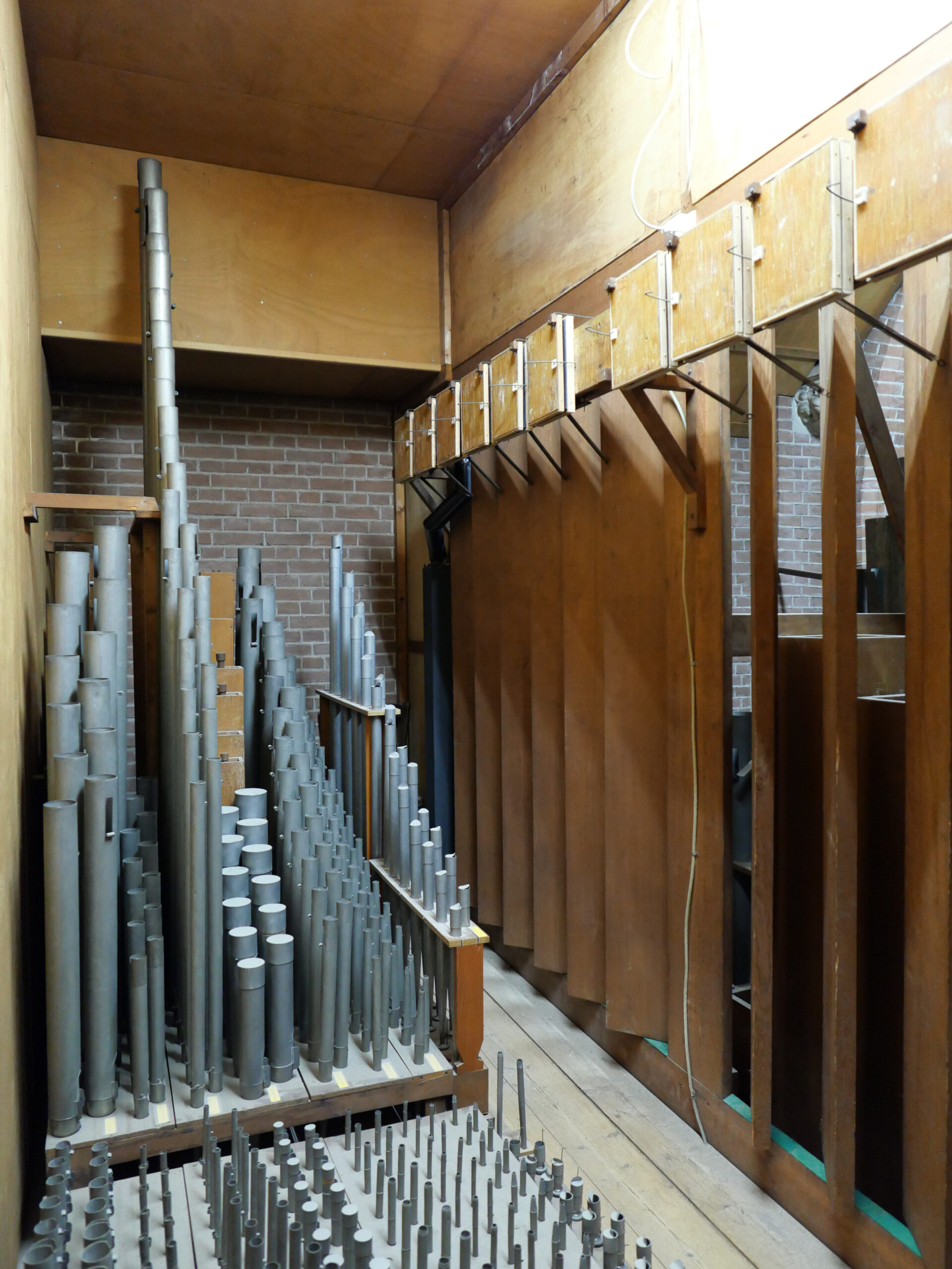 - Het pijpwerk van het Hoofdwerk. Een laag stof en gruis ligt op de windladen en in het pijpwerk.