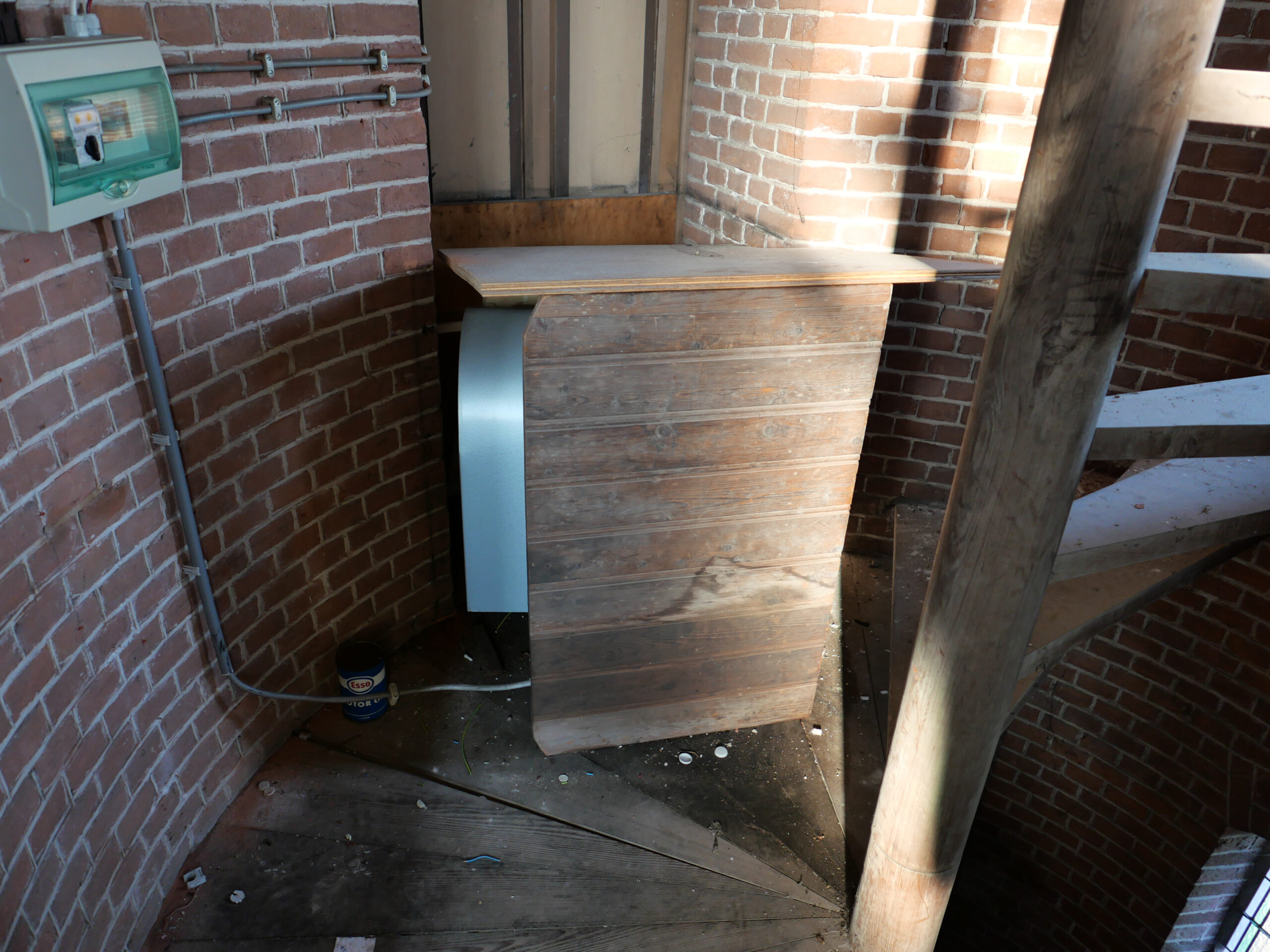 - De windmotor staat enigszins provisorisch in het trappenhuis van de toren geplaatst.