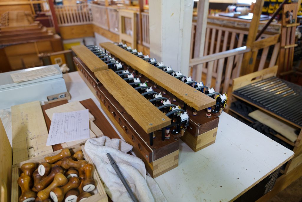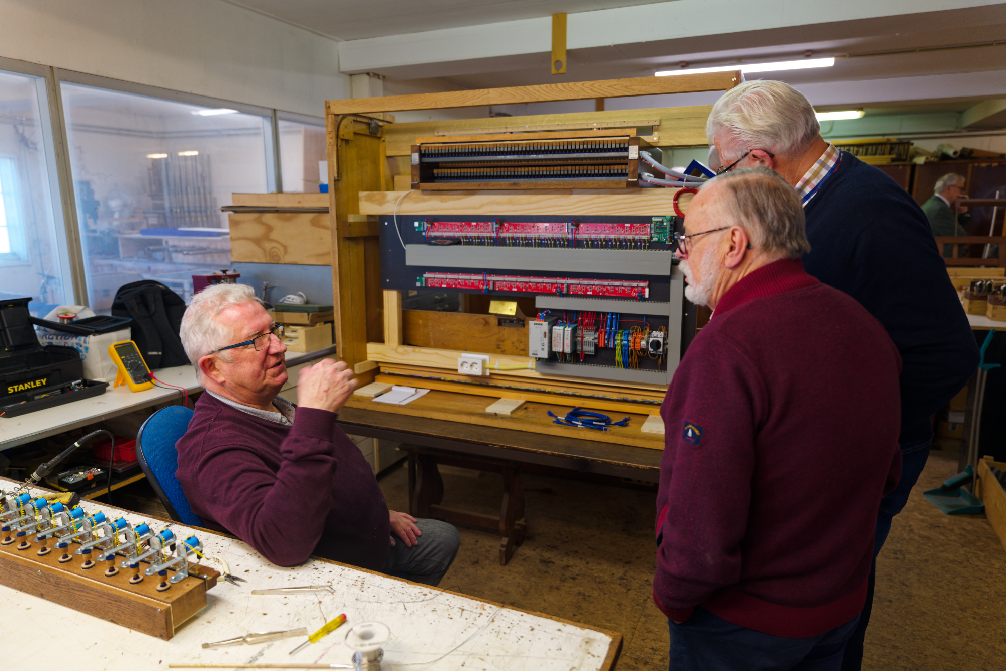 - Marien Verhulst (rechts) en Peter Dobbe (tweede van rechts) bij de speeltafel van het Hilboesen-orgel in de werkplaats te Hillegom.